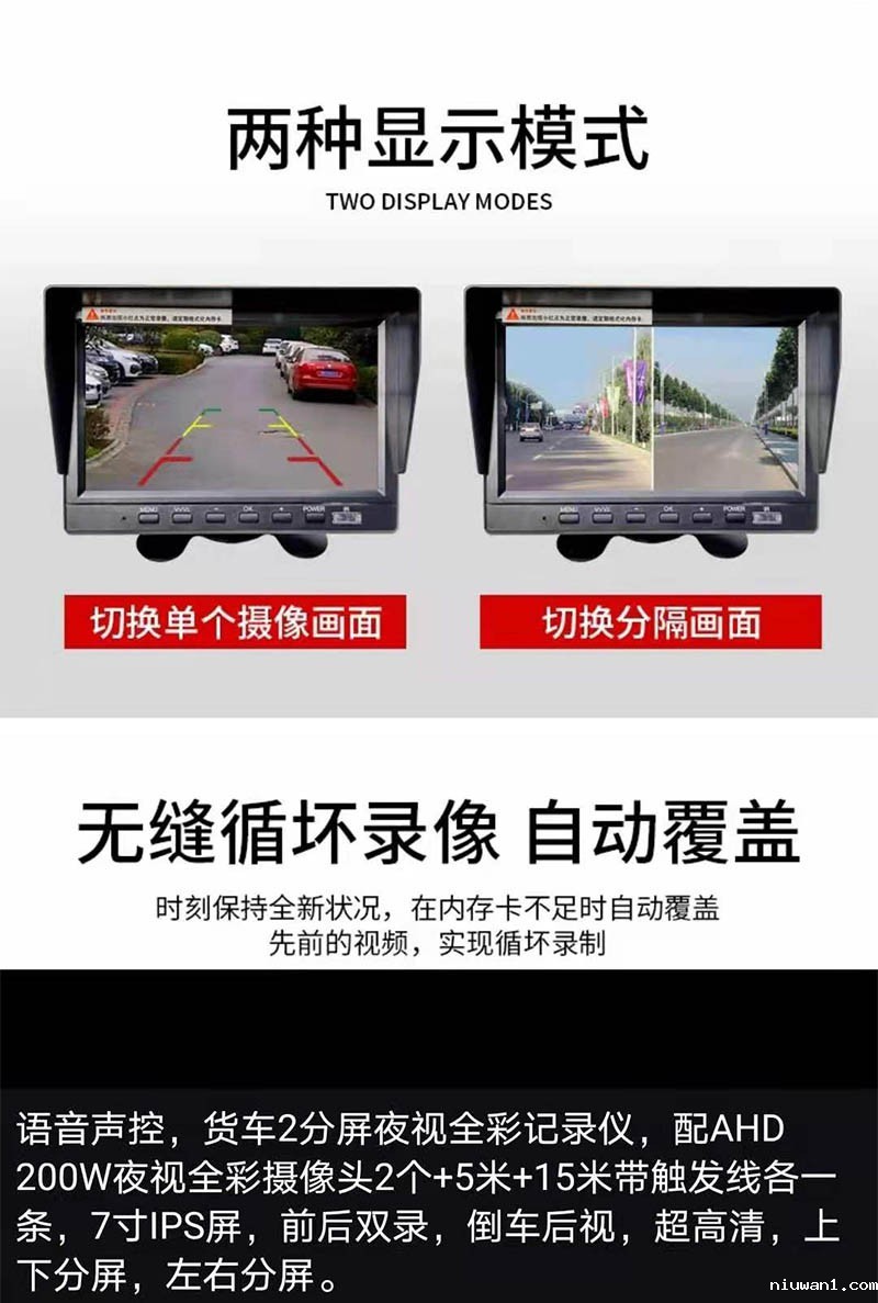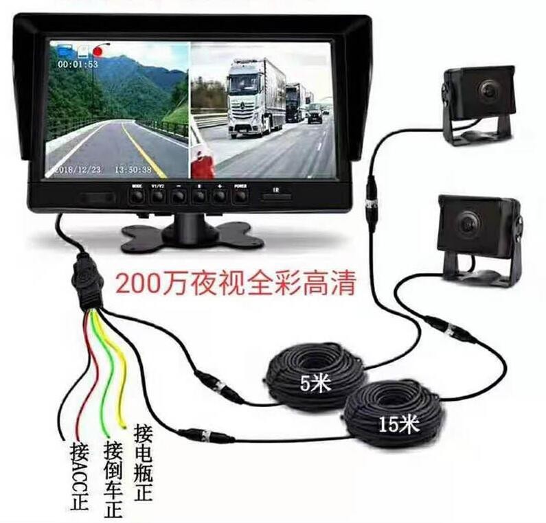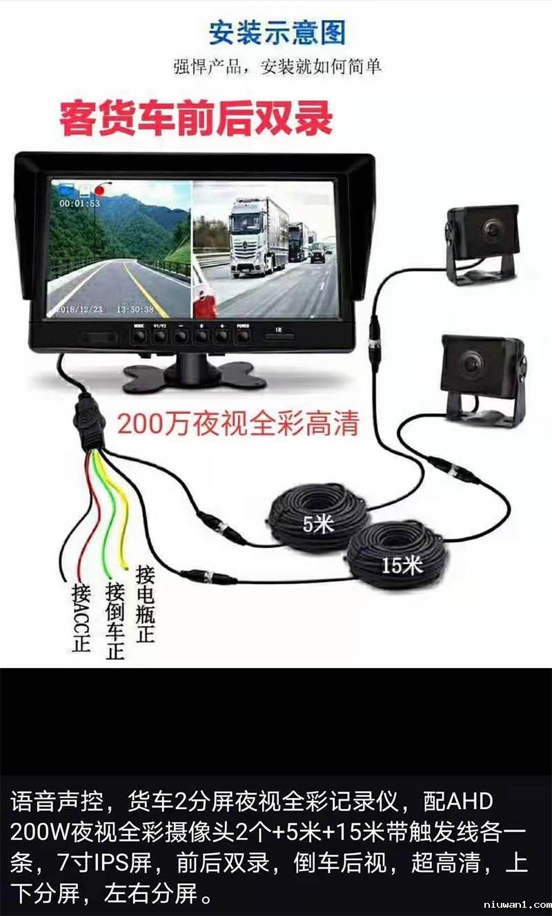 货车2分屏夜视全彩记录仪: 语音声控,货车2分屏夜视全彩记录仪, 配AHD 200W夜视全彩摄像头2个+5米+15米带触发线各一条,7寸IPS屏,前后双录,倒车后视,高清,上下分屏,左右分屏。
