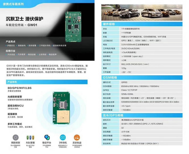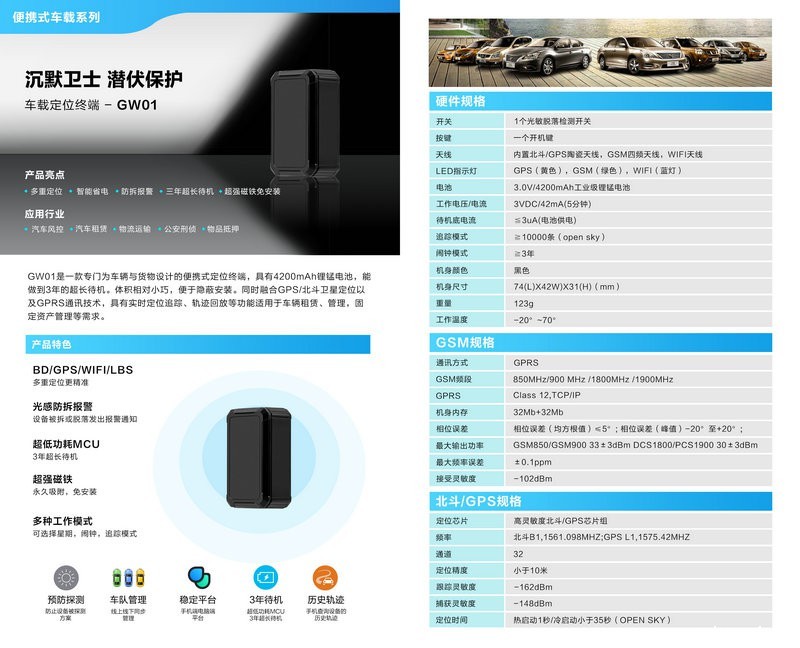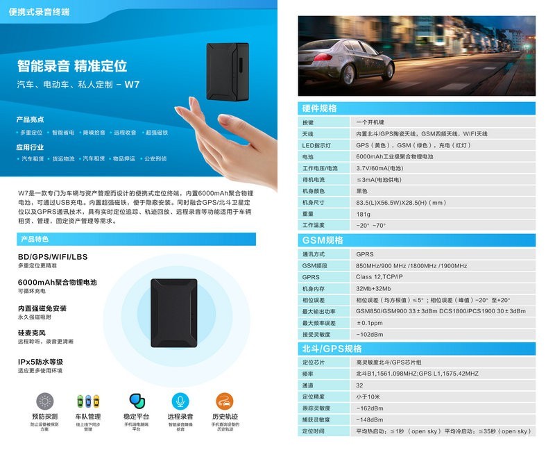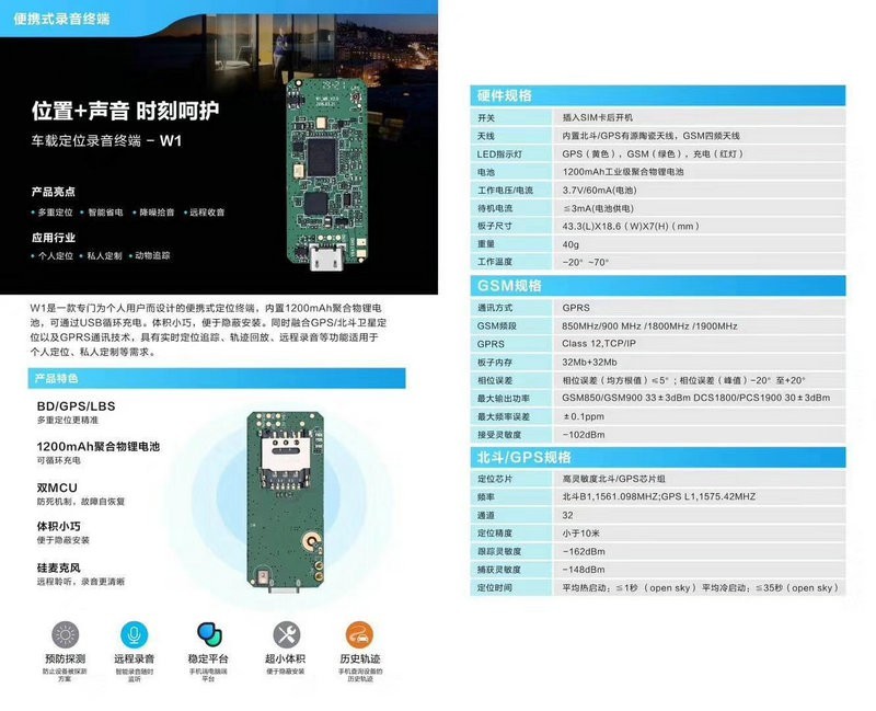 W1是一-款专门为个人用户而设计的便携式定位终端,内置1200mAh聚合物锂电池,可通过USB循环充电。体积小巧,便于隐蔽安装。同时融合GPS/北斗卫星定位以及GPRS通讯技术,具有实时定位追踪、轨迹回放、远程录音等功能适用于个人定位、私人定制等需求。
